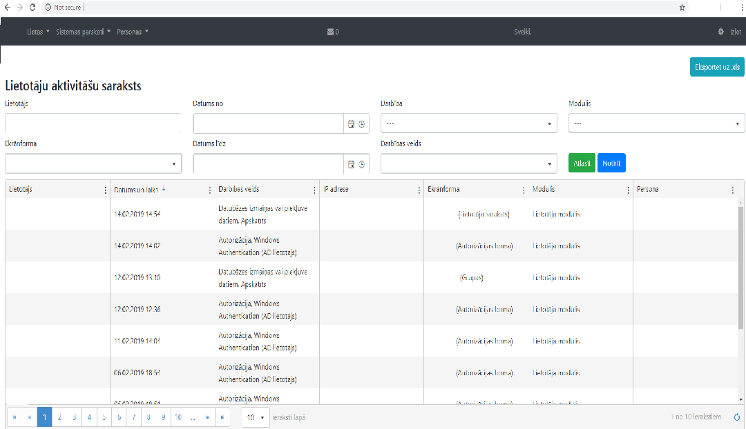 Nodrošina lietotāju aktivitāšu saraksta ar atlasītām kollonām uz xls, nemot vērā filtra kritērijus, bet neņemot vērā attēloto ierakstu skaitu un atrašanās vietu lapā.
