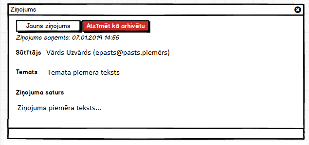 Uzklikšķinot uz konkrētā paziņojuma ieraksta sarakstā, tiek atvērts paziņojuma skatīšanas logs, kur var detalizētāk redzēt ziņojuma informāciju(sk.att.3.). Kā arī konkrēto ziņojumu arhivēt vai izveidot jaunu ziņojumu.