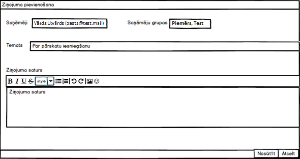 •Saņēmēji – teksta lauks, kur pēc daļējās vārda vai uzvārda ievades(minimāli 6 simboli) atlasa lietotāju/-us, kuriem nosūtīt ziņojumu. Tiek attēlots arī lietotāja e-pasts, lai varētu nosķirt lietotājus, gadījumos, kad lietotājiem ir vienāds vārds un uzvārds.