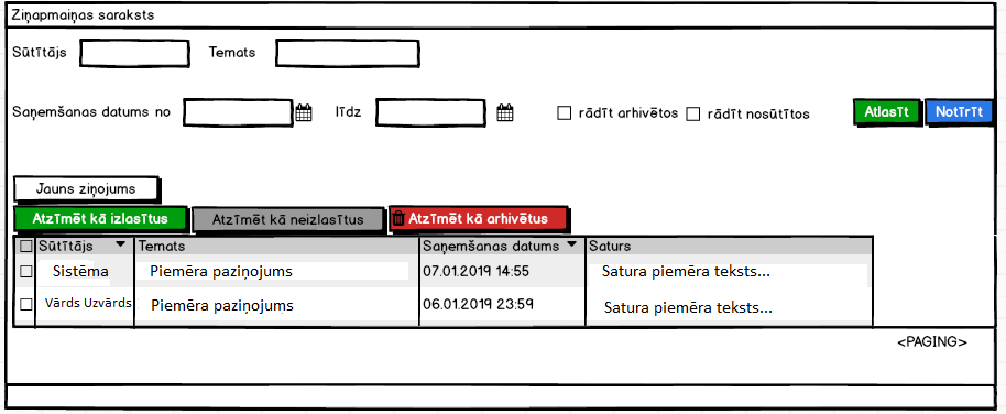 Sistēmā ir pieejams ziņojumu saraksts, kur katrs lietotājs redz sarakstus ar paziņojumiem, kuri adresēti viņam. Lietotājs var atlasīt ziņojumus izmantojot šādus filtrus: